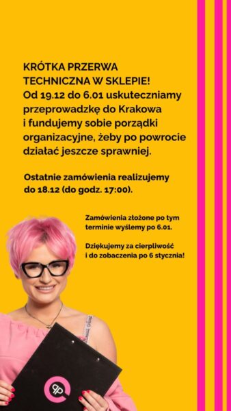• Od 19.12 do 6.01 uskuteczniamy przeprowadzkę do Krakowa i fundujemy sobie porządki organizacyjne, żeby po powrocie działać jeszcze sprawniej.