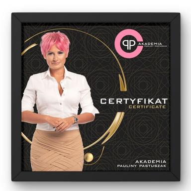 Drewniana ramka w rozmiarze 30×30 cm w kolorze białym idealnie zabezpieczy Twój bezcenny certyfikat zdobyty na szkoleniu w Akademii Pauliny Pastuszak!